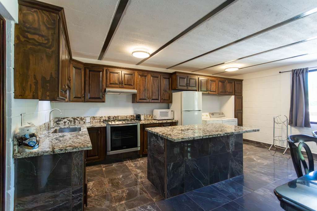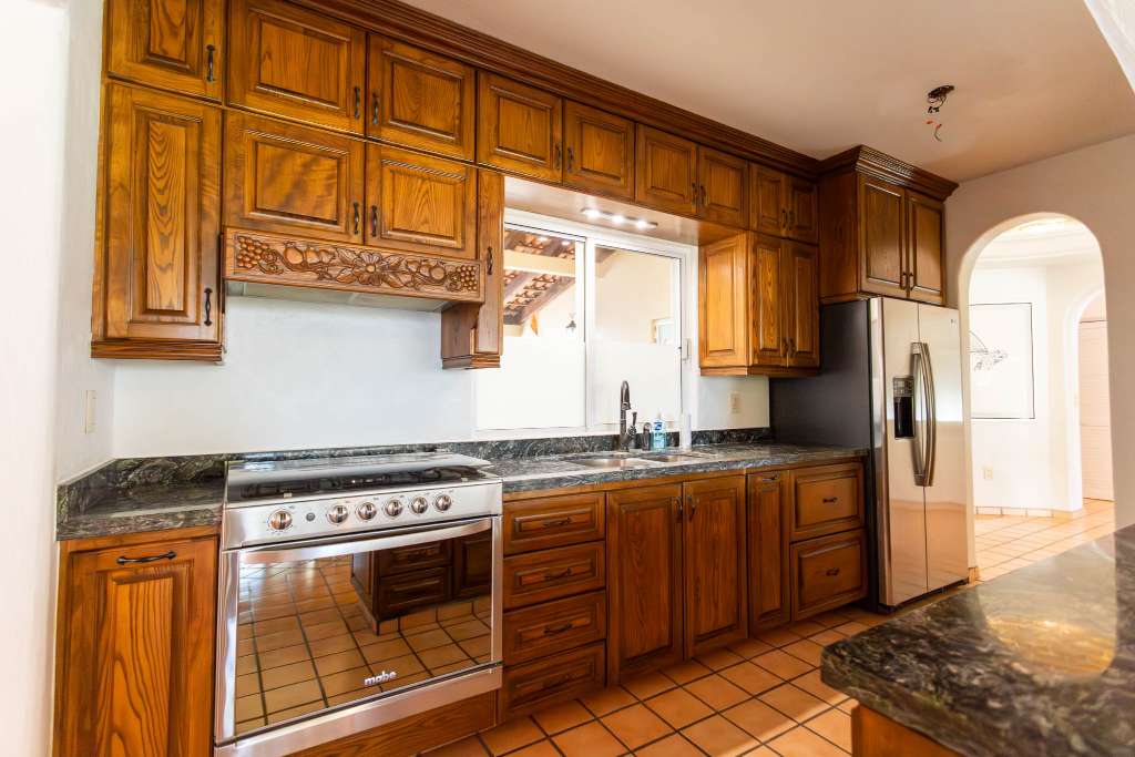 Fully equipped kitchen with granite countertops, solid wood cabinetry, and ample pantry