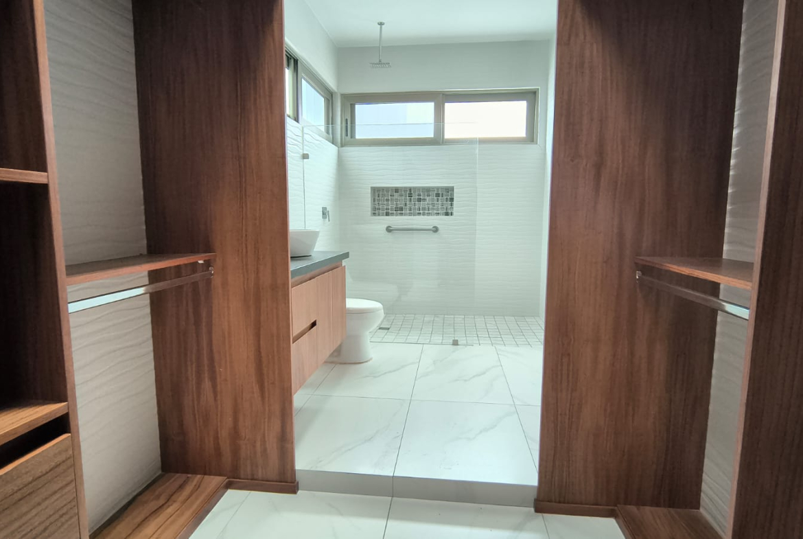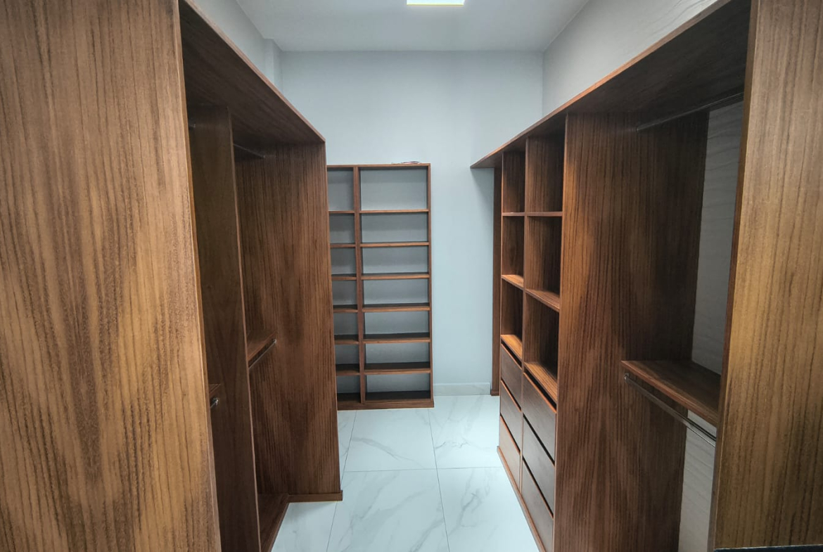 A walk-in closet in the master bedroom with high-quality woodwork.