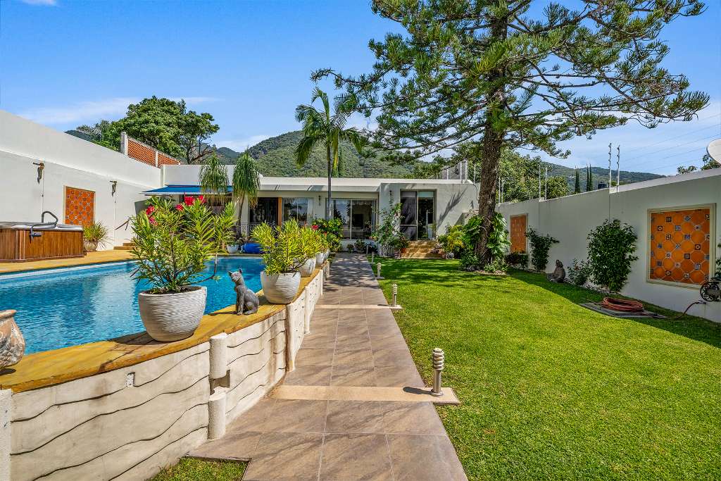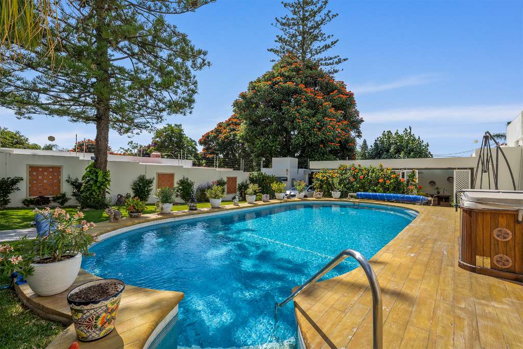 The home is designed for enjoyment both indoors and outdoors: cooks kitchen with top of the line appliances, lots of storage and granite countertops, 4 bedrooms, each with its own A/C unit and full bathroom for complete privacy and comfort, spacious living room with A/C, formal-elegant bar connecting BBQ area and the rest of the entertaining areas, solar heated pool surrounded by a gorgeous mature garden plus 2 more pool baths, private parking and solar panels that generate electricity—making this residence an efficient and sustainable choice and backup automatic electric generator.