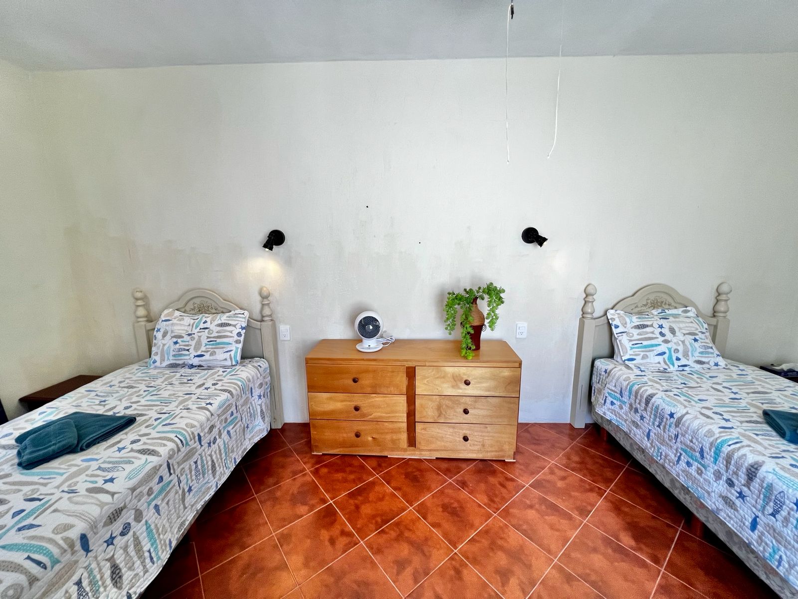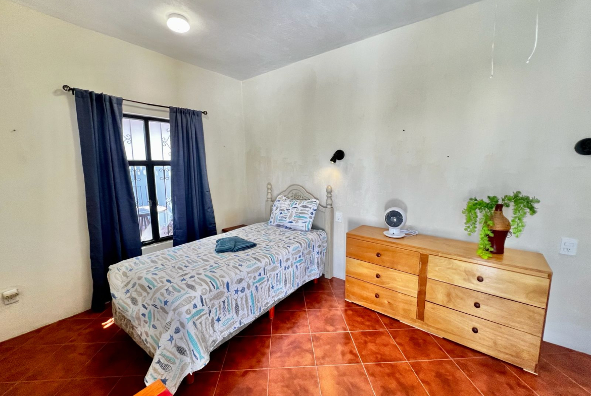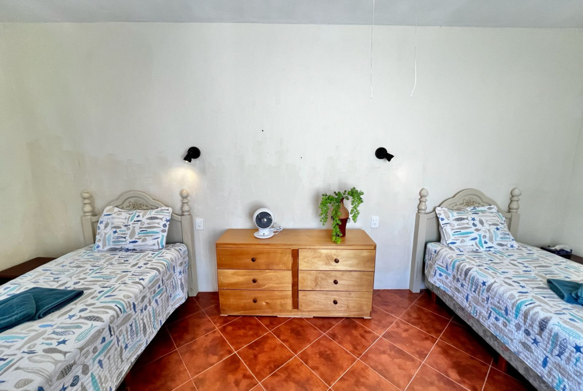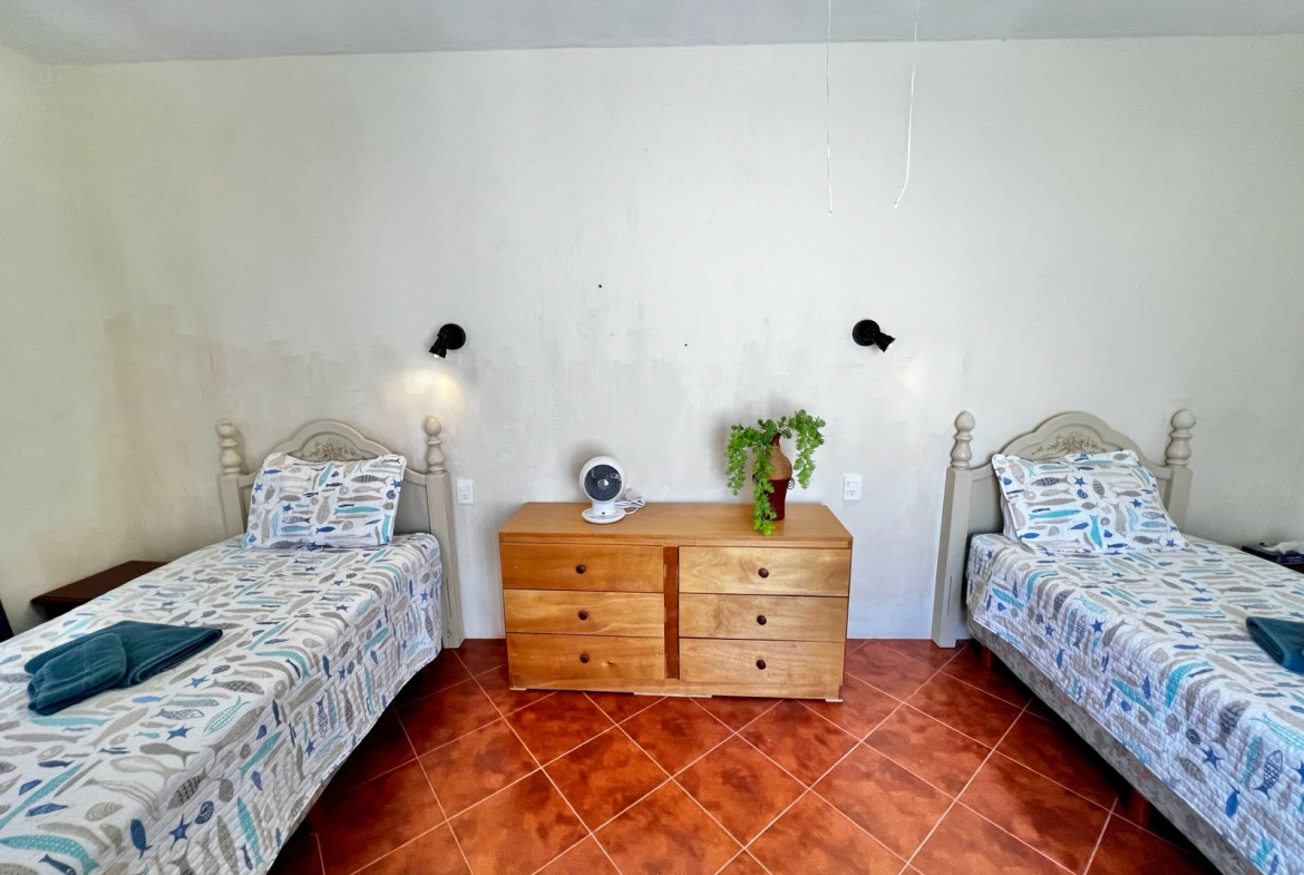 bedroom with two individual size beds, one bathroom, shared common kitchen.