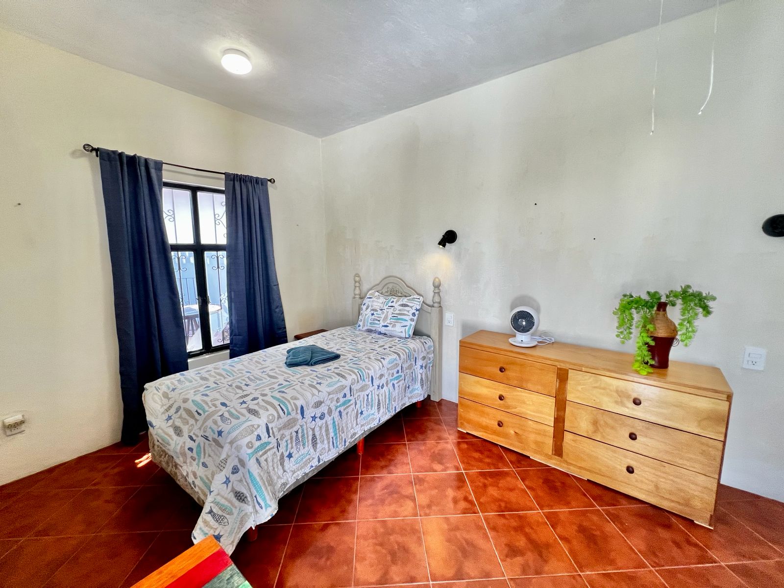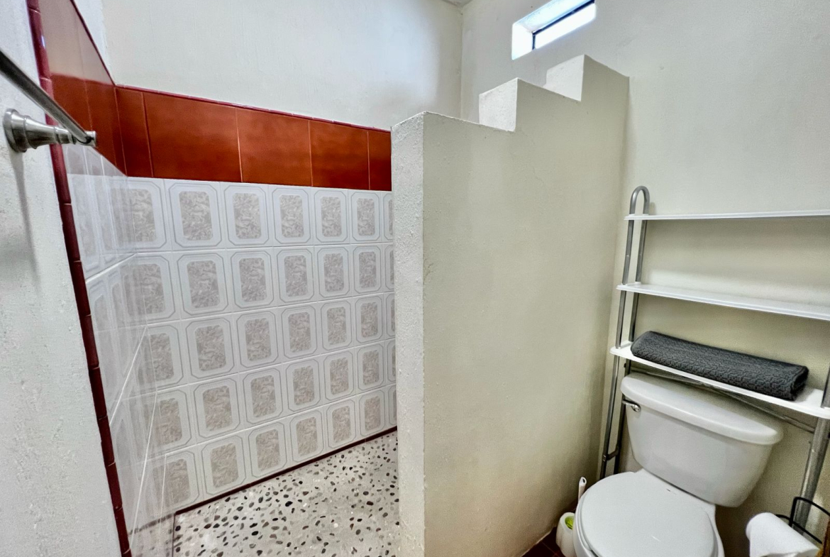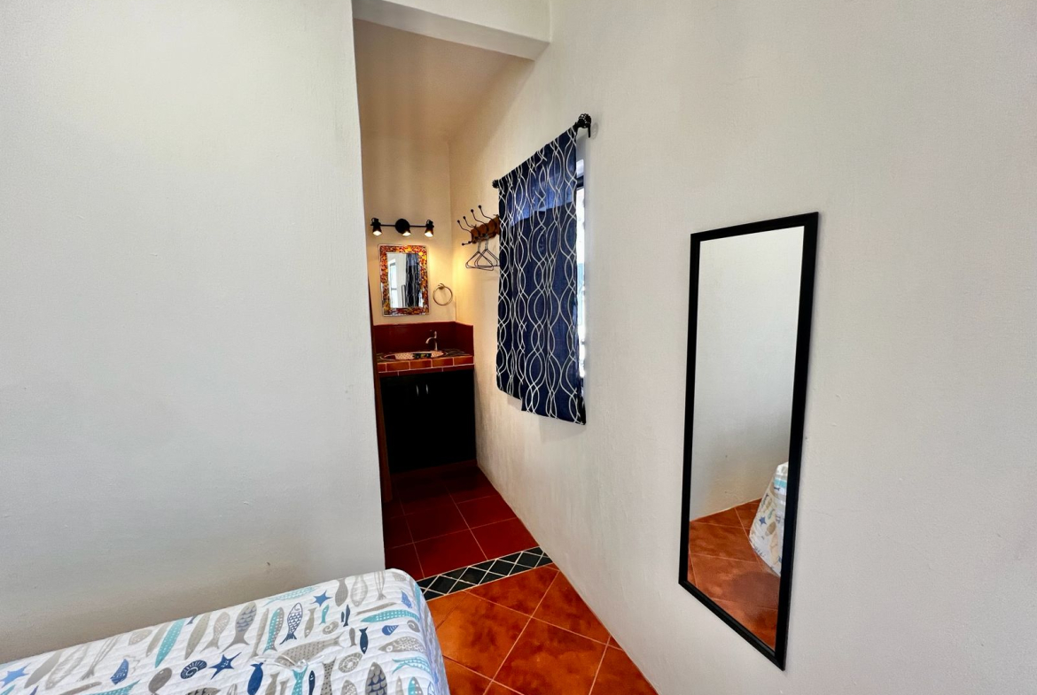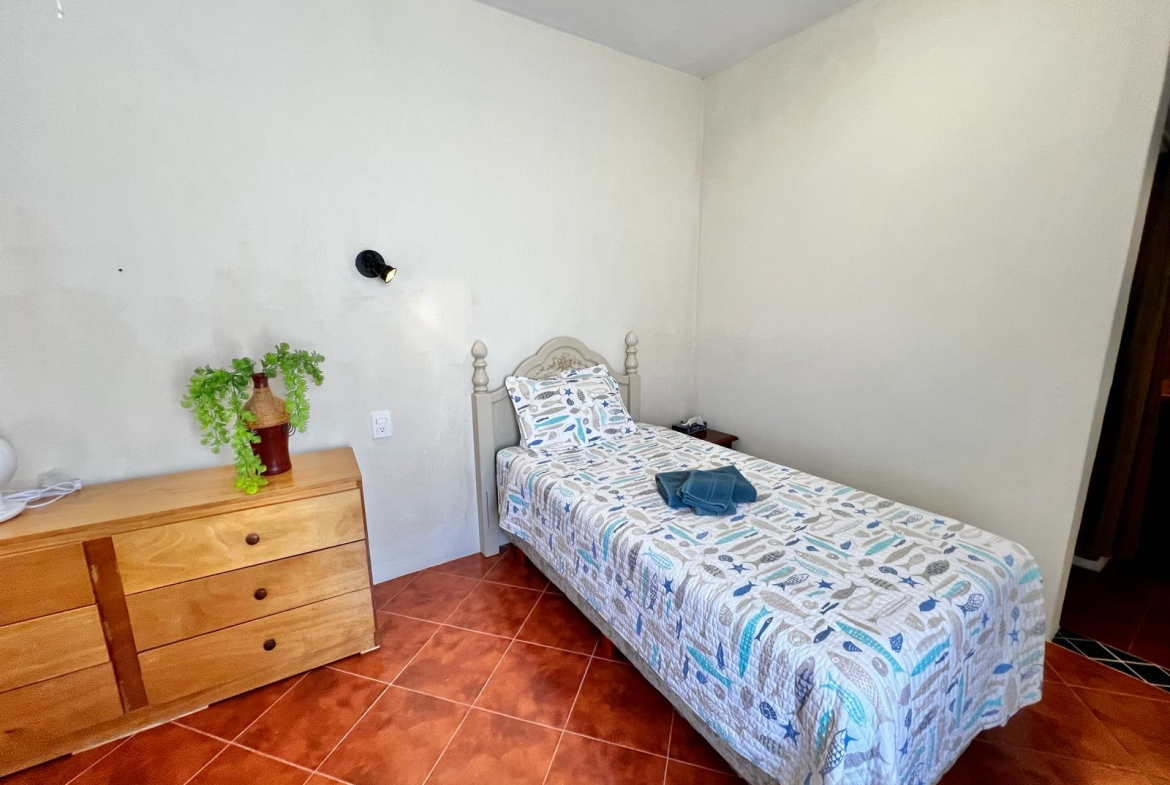 bedroom with two individual size beds, one bathroom, shared common kitchen.